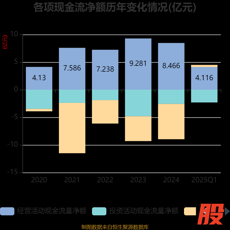 截至2025年一季度末,公司经营活动现金流净额为4.12亿元,同比增长96.38%;筹资活动现金流净额3796.01万元,同比增加1.24亿元;投资活动现金流净额-2.31亿元,上年同期为-1.69亿元。