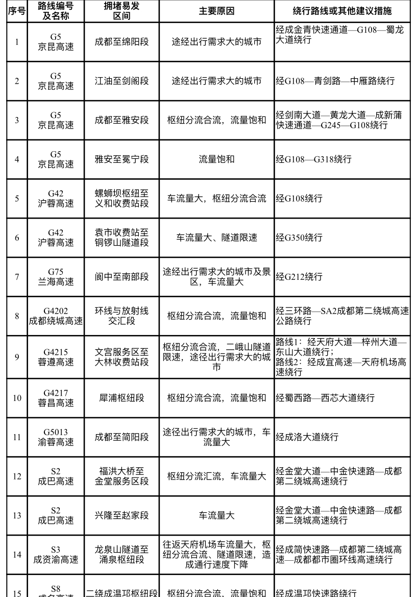 预计国庆中秋假期全省公路网流量双节时段达峰,综合客运量总体呈“首尾高中间低”分布态势。高速公路车流量国庆节达最高峰,突破525万辆次,有望创单日流量历史新高,中秋节达次高峰。跨省总流量约317.4万辆次鑫创国际,日均39.7万辆次,同比增长10.3%。其中:川渝之间流量最大,其次是川陕方向、川黔方向、川滇方向、川甘方向、川青方向。从区域分布看,高速公路网车流量在成都、乐山、南充及川南人口稠密地区集中特征明显。全省高速公路流量排名前十的市(州)包括:成都、宜宾、泸州、南充、乐山、德阳、眉山、绵阳、内江、广安等。